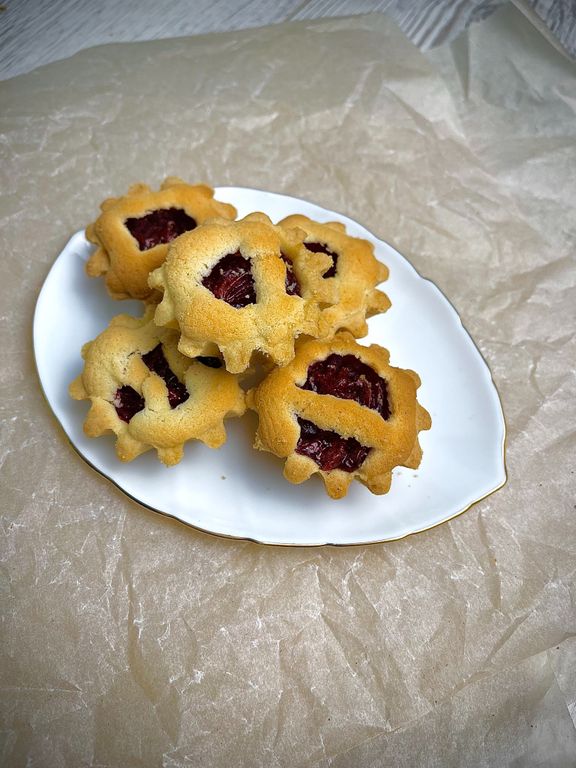Маленькая песочная корзиночка начинена двойной начинкой, сверху оформлено сеточкой из песочного теста.