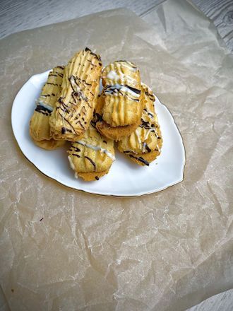 Песочное печенье в виде палочек склеено между собой сливочной начинкой и отделано шоколадной глазурью.