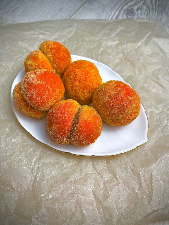 Две цветные полусферки, склеенные между собой вареной сгущенкой, обсыпаны сахаром.