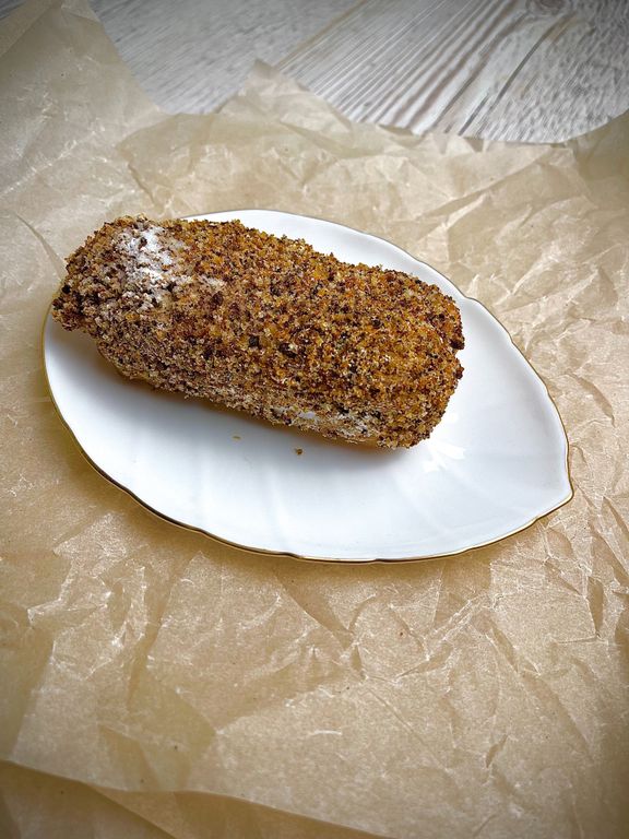 Заварной полуфабрикат начинен творожно-сливочным кремом, сверху посыпан бисквитно-шоколадной крошкой. В коробке 6 шт.