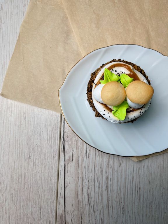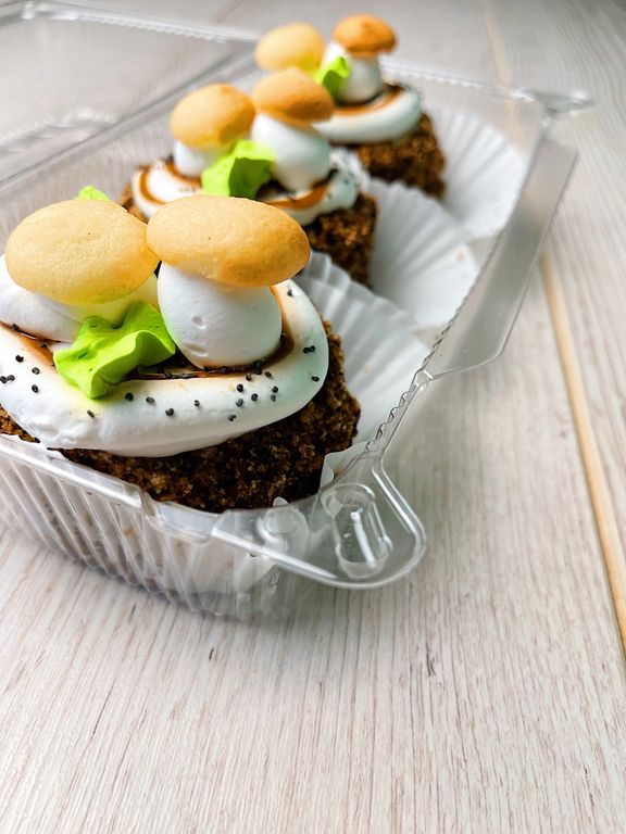 Пирожное в виде цилиндра состоит из бисквита на кефире с добавлением свежей ягоды смородины, пропитано сиропом и прослоено сливочно-сметанным кремом. Сверху пирожное оформлено грибочками из взбитых сливок и обсыпано бисквитно- шоколадной крошкой. В коробке 4 шт.