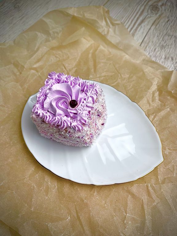 Пирожное в виде цилиндра состоит из воздушного бисквита, пропитано сиропом и прослоено кремом из взбитых сливок с черничным конфитюром, отделан кокосовой стружкой и взбитыми сливками. В коробке 4 шт.