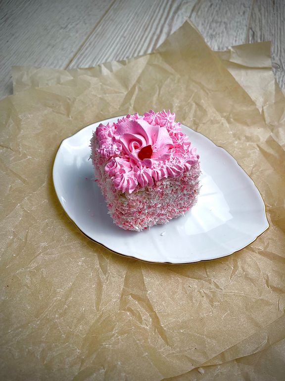 Пирожное в виде цилиндра состоит из воздушного бисквита, пропитано сиропом и прослоено кремом из взбитых сливок с вишневым конфитюром, отделано кокосовой стружкой и взбитыми сливками. В коробке 4 шт.