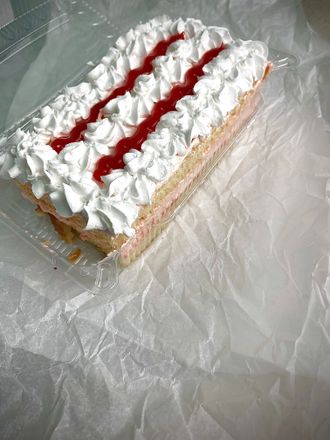 Несколько слоев воздушного бисквита, пропитаны сиропом, прослоены кремом со взбитыми сливками и начинкой «Клубника». Сверху пирог отделан клубничным гелем и взбитыми сливками.