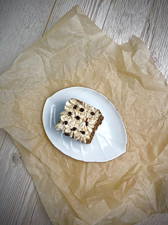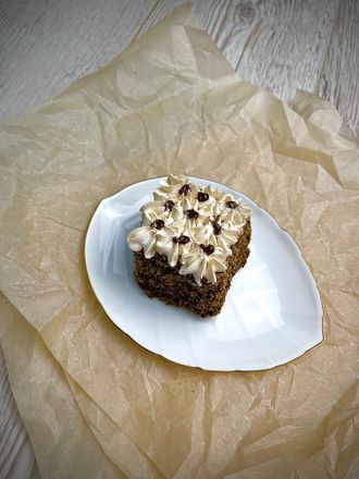 Шоколадный бисквит, пропитан сиропом и прослоен начинкой Карамель, дроблённым арахисом и взбитыми сливками. Сверху оформлен сливками, арахисом и гелем Карамель.