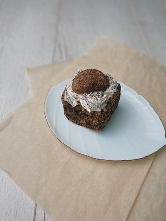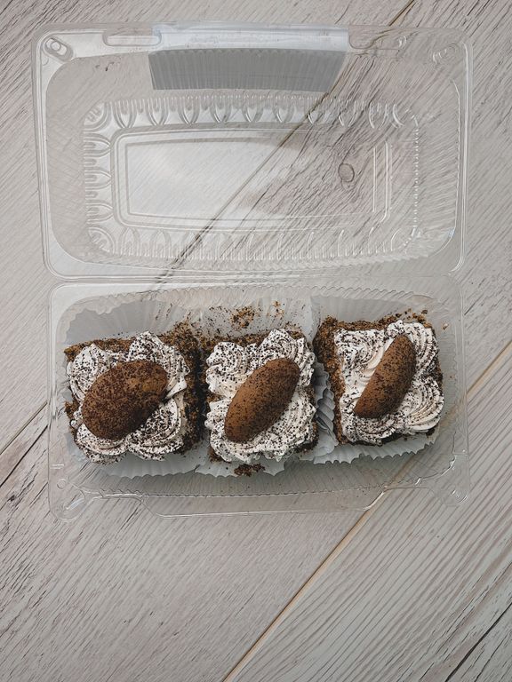 Воздушный бисквит, пропитан кофейным сиропом, прослоен начинкой «Шоколад» и кремом со сливками со вкусом Тирамису , сверху отделан сливками и бисквитным печеньем, посыпан какао.